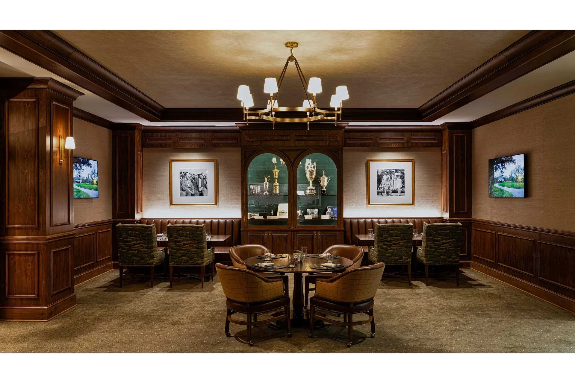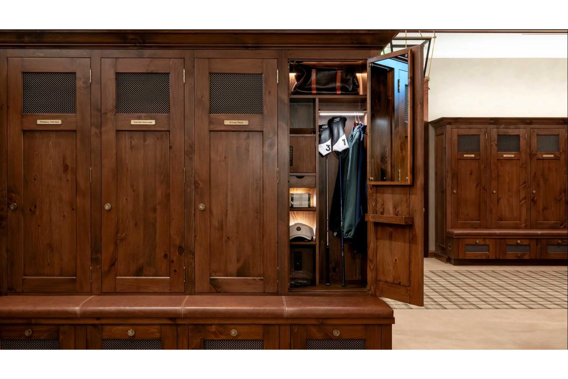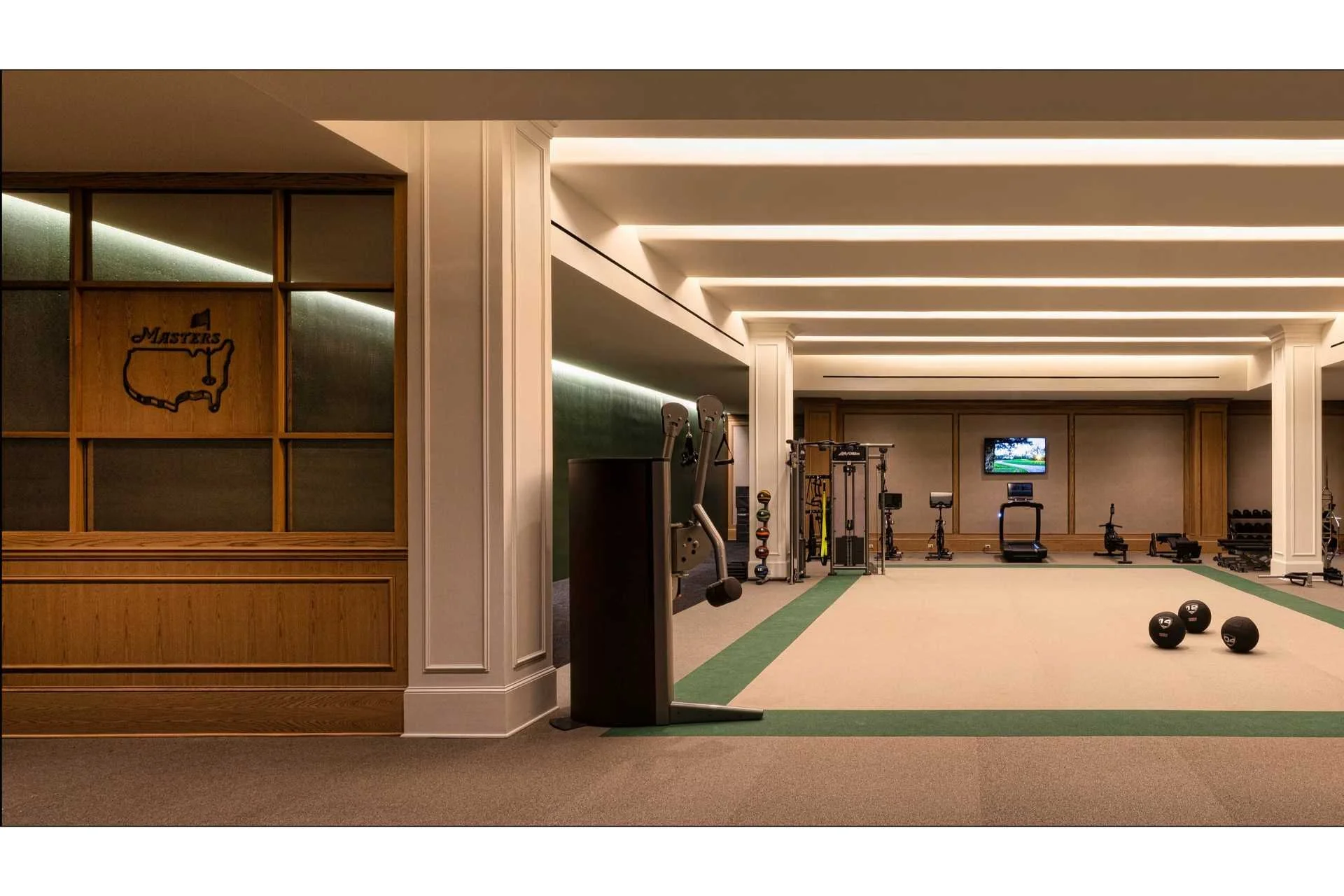 The complex includes a stylish locker room with 100 private lockers and charging facilities. The lounge area features a tip of the hat to Augusta founder Bobby Jones alongside other historical detail.
